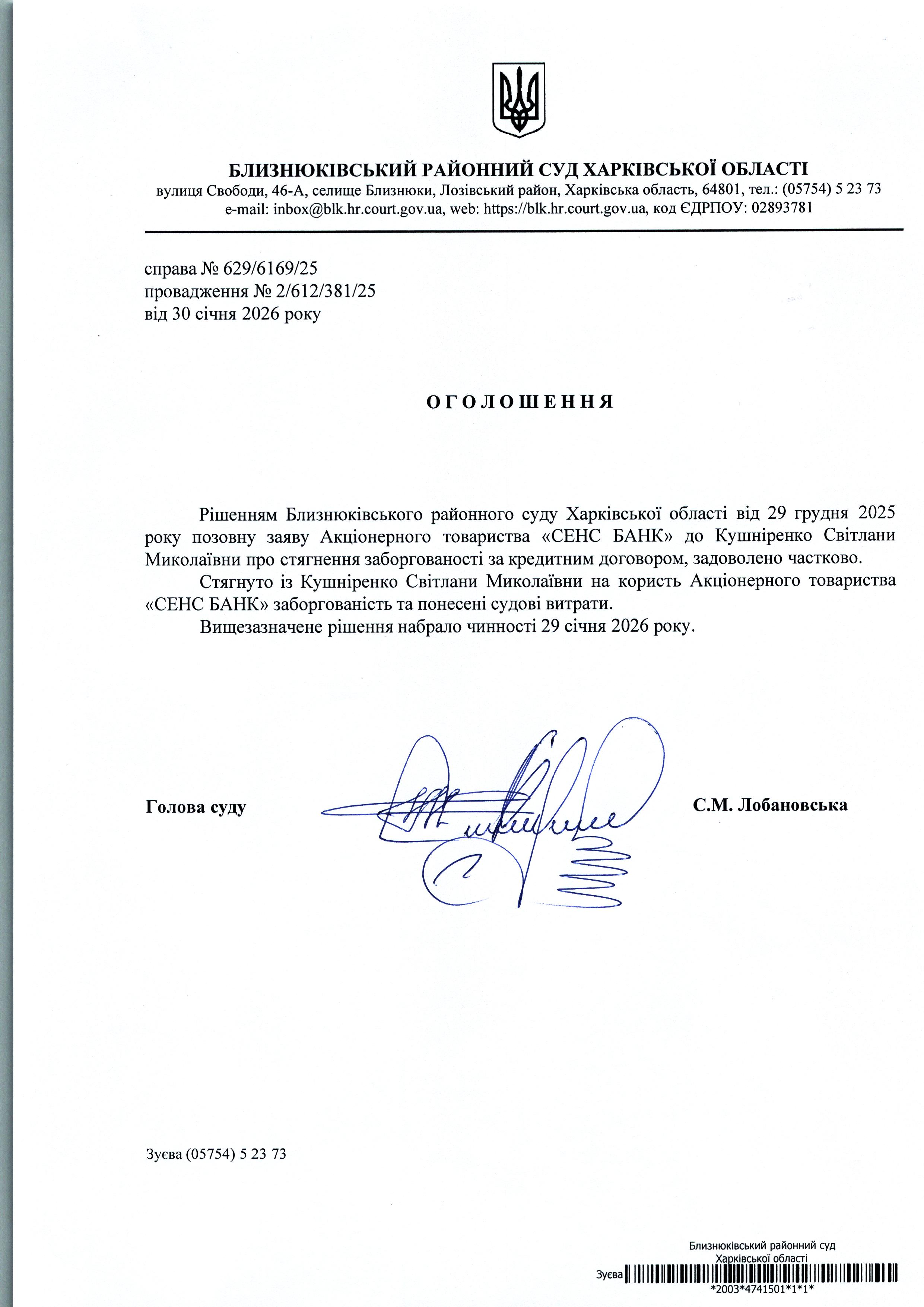 Оголошення про набрання чинності рішення суду від 29 грудня 2025 року за позовом АТ "СЕНС БАНК" до Кушніренко Світлани Миколаївни про стягнення заборгованості