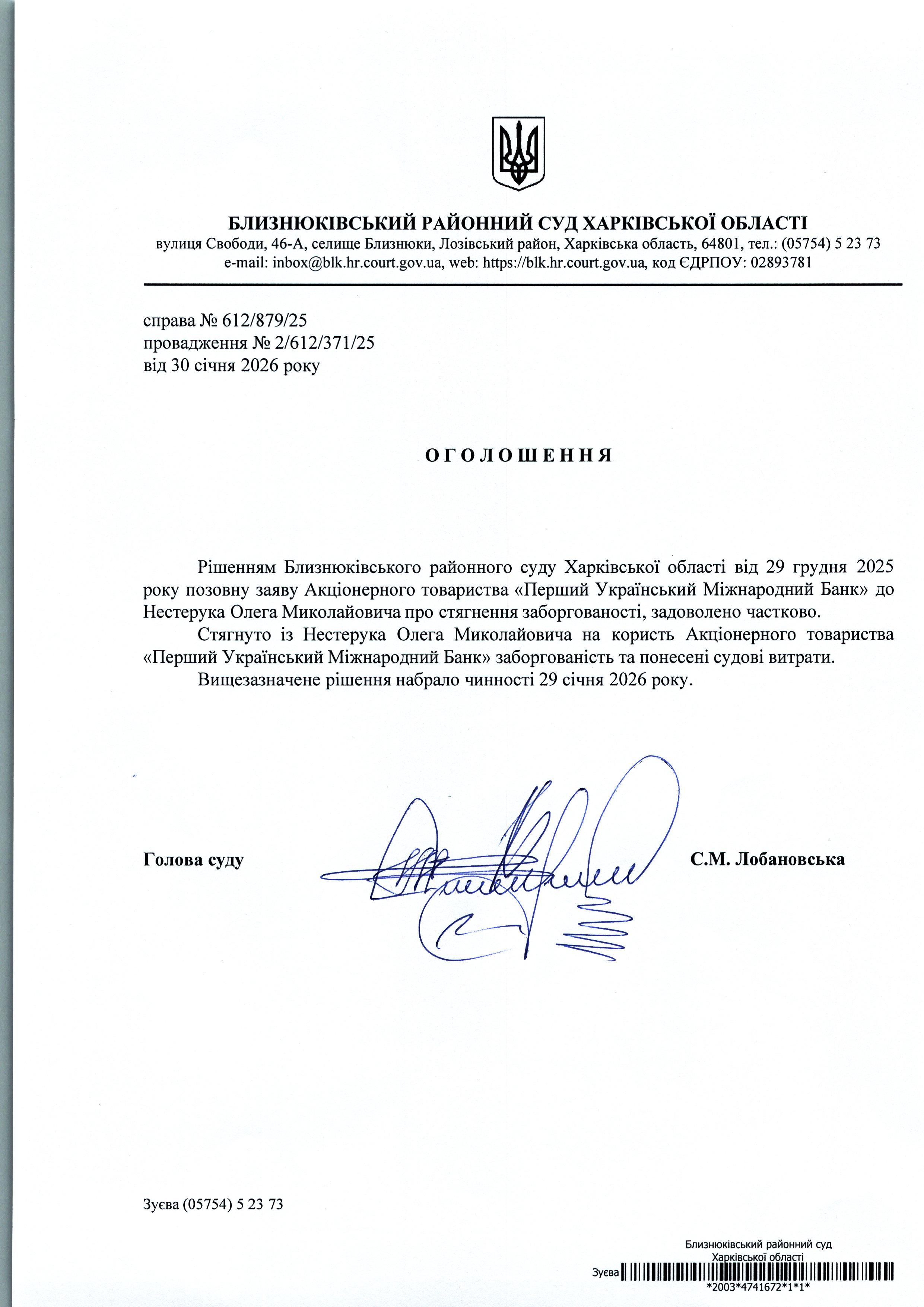 Оголошення про набрання чинності рішення суду від 29 грудня 2025 року за позовом АТ "Перший Український Міжнародний Банк" до Нестерука Олега Миколайовичапро стягнення заборгованості