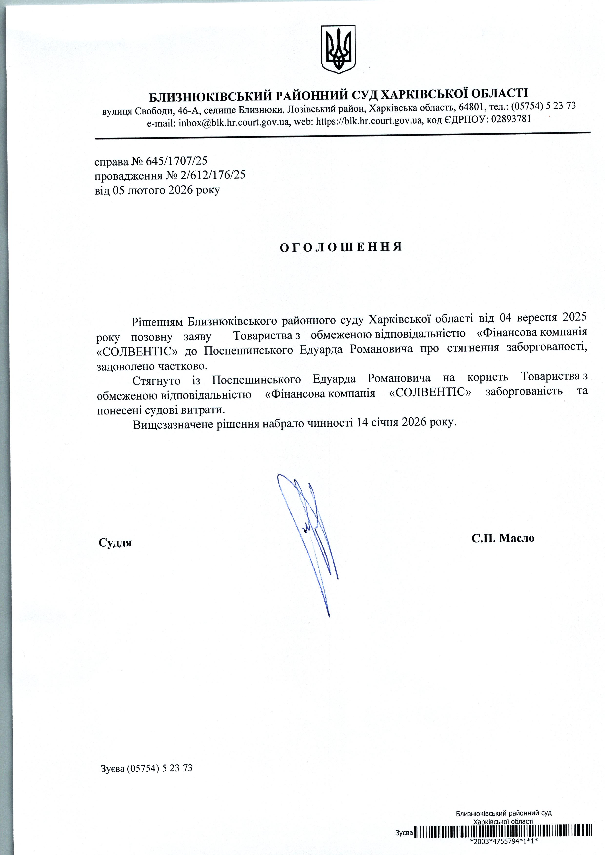 Оголошення про набрання чинності рішення суду від 04 вересня 2025 року за позовом ТОВ "Фінансова компанія "СОЛВЕНТІС" до Поспешинського Едуарда Романовича про стягнення заборгованості