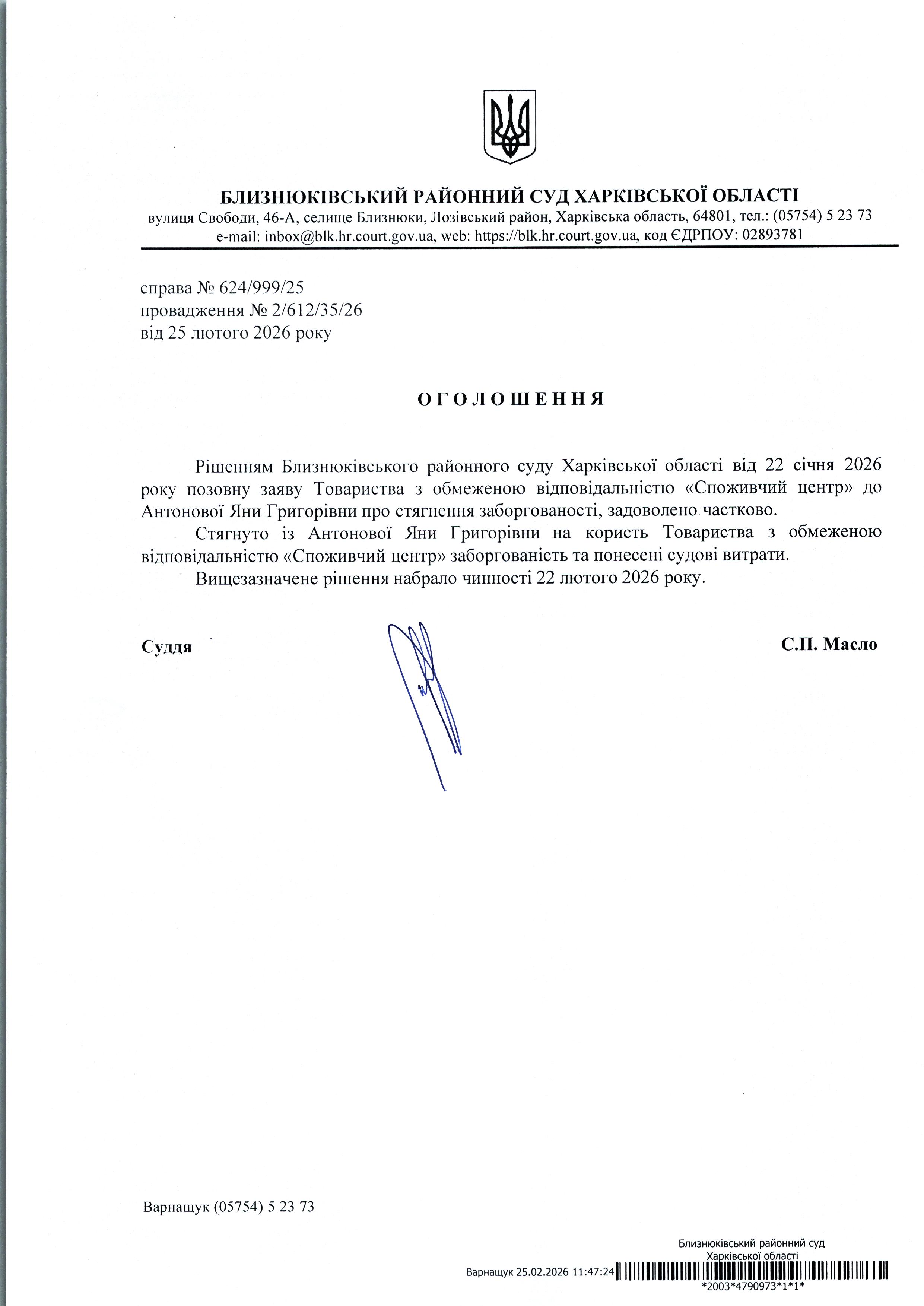 Оголошення про набрання чинності рішення суду від 22 січня 2026 року за позовом ТОВ "Споживчий центр" до Антонової Яни Григорівни про стягнення заборгованості