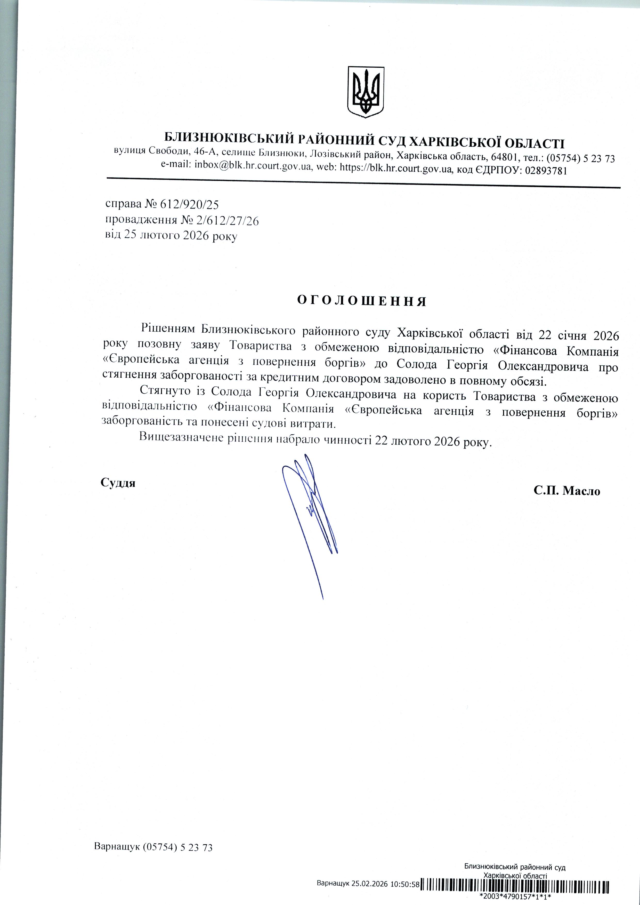 Оголошення про набрання чинності рішення суду від 22 січня 2026 року за позовом ТОВ "Фінансова Компанія "Європейська агенція з повернення боргів" до Солода Георгія Олександровича про стягнення заборгованості