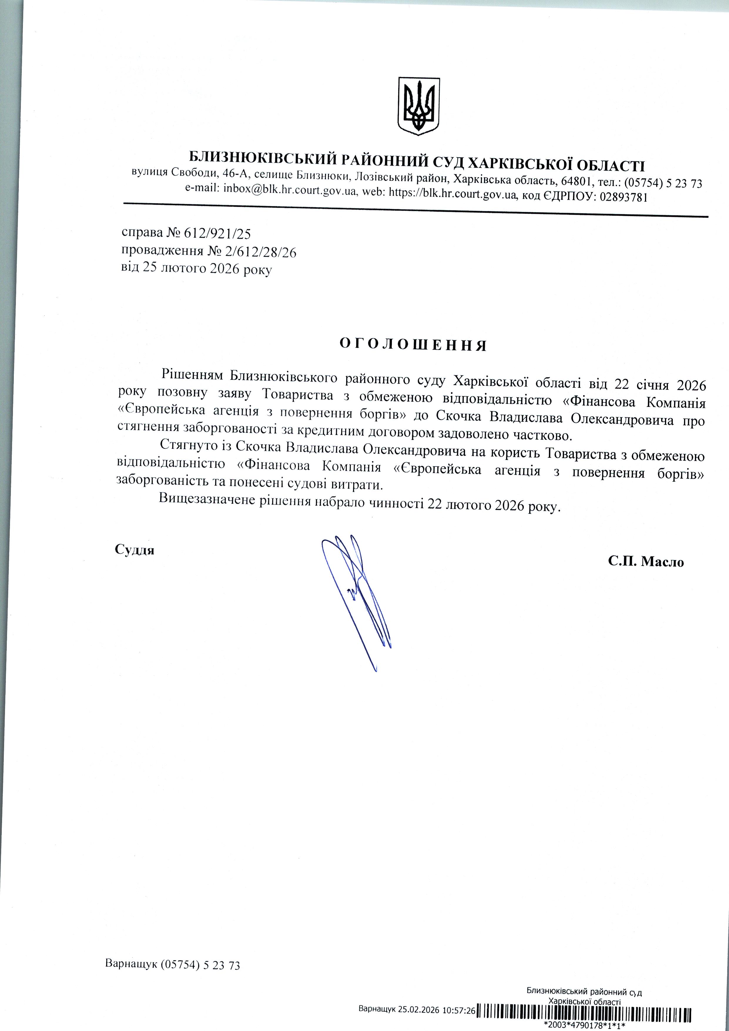 Оголошення про набрання чинності рішення суду від 22 січня 2026 року за позовом ТОВ "Фінансова Компанія "Європейська агенція з повернення боргів" до Скачка Владислава Олександровича про стягнення заборгованості