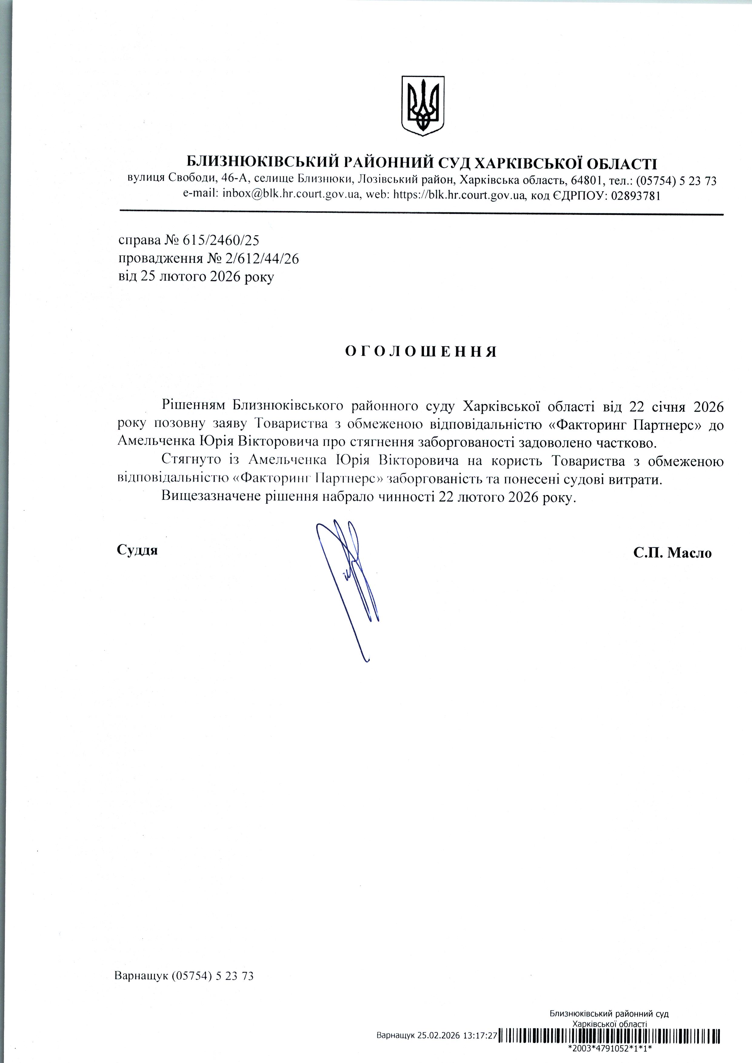 Оголошення про набрання чинності рішення суду від 22 січня 2026 року за позовом ТОВ "Факторинг Партнерс" до Амельченка Юрія Вікторовича про стягнення заборгованості