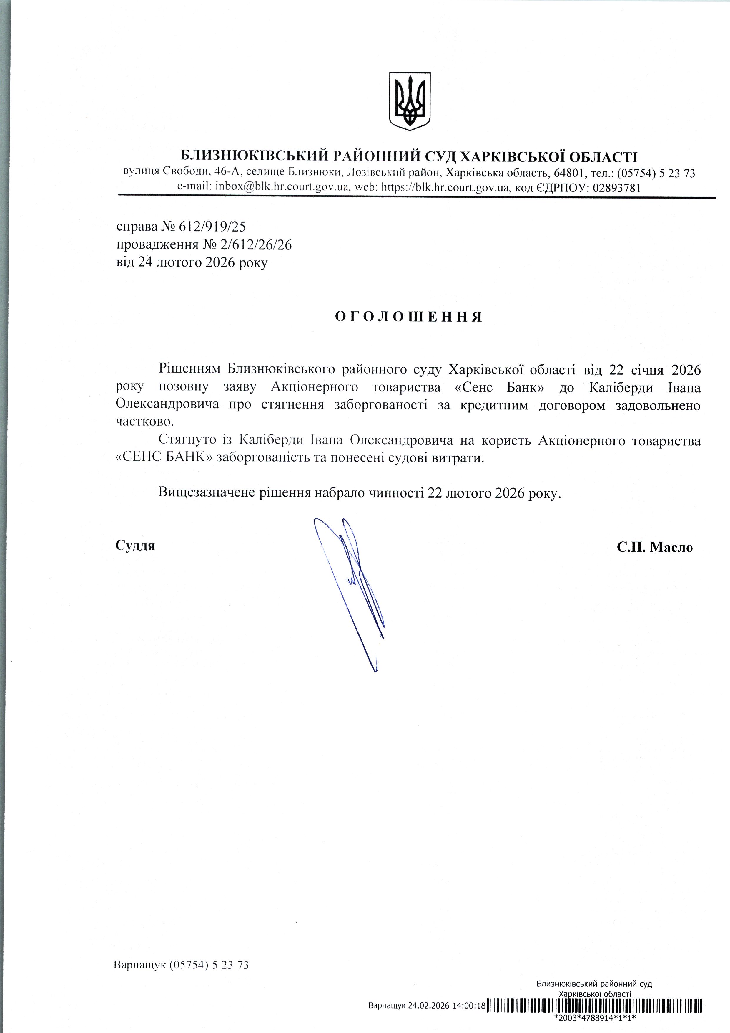 Оголошення про набрання чинності рішення суду від 22 січня 2026 року за позовом АТ "Сенс Банк" до Келеберди Івана Олександрівна про стягнення заборгованості