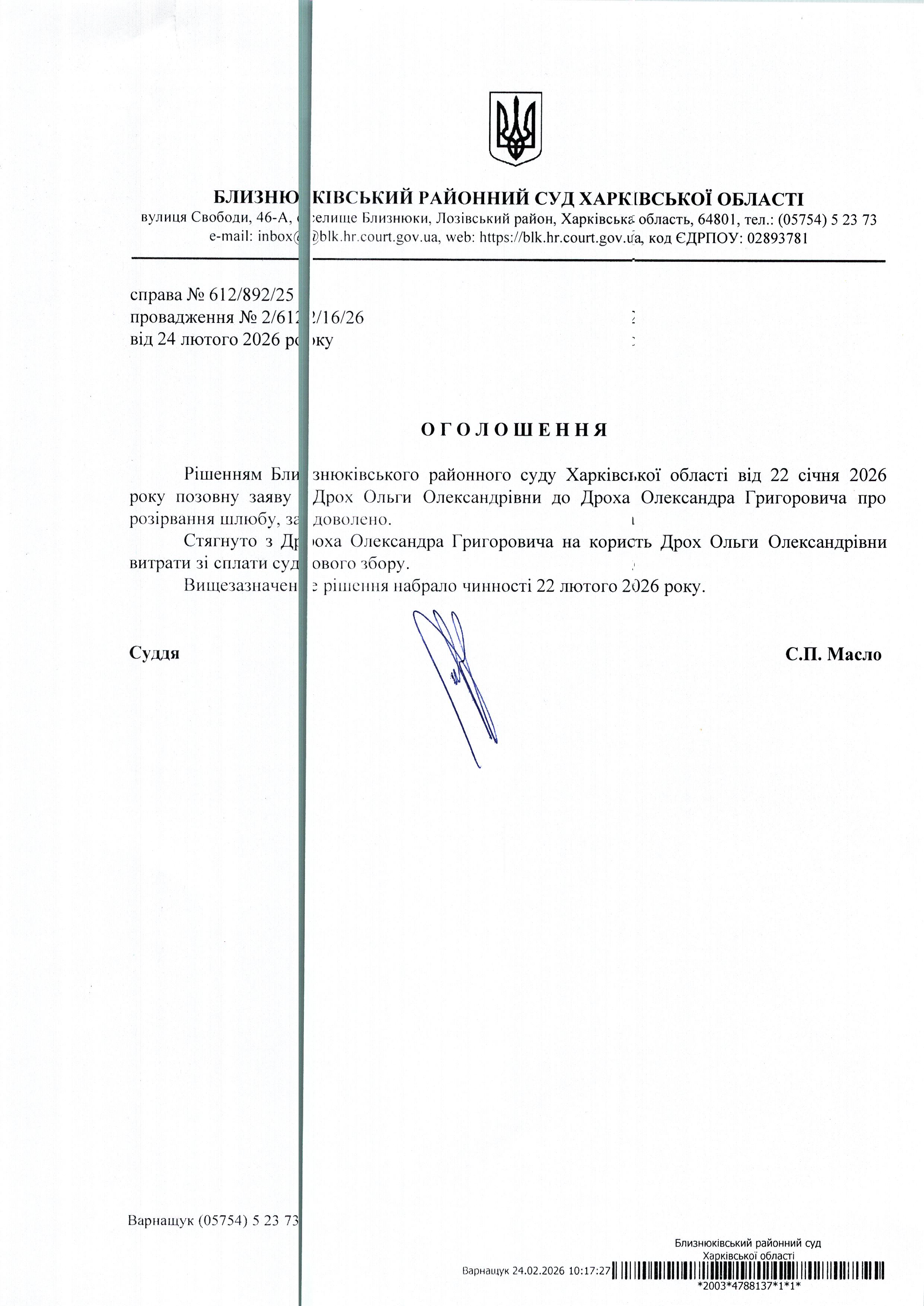 Оголошення про набрання чинності рішення суду від 22 січня 2026 року за позовом Дрох Ольги Олександрівни до Дроха Олександра Григоровича про розірвання шлюбу