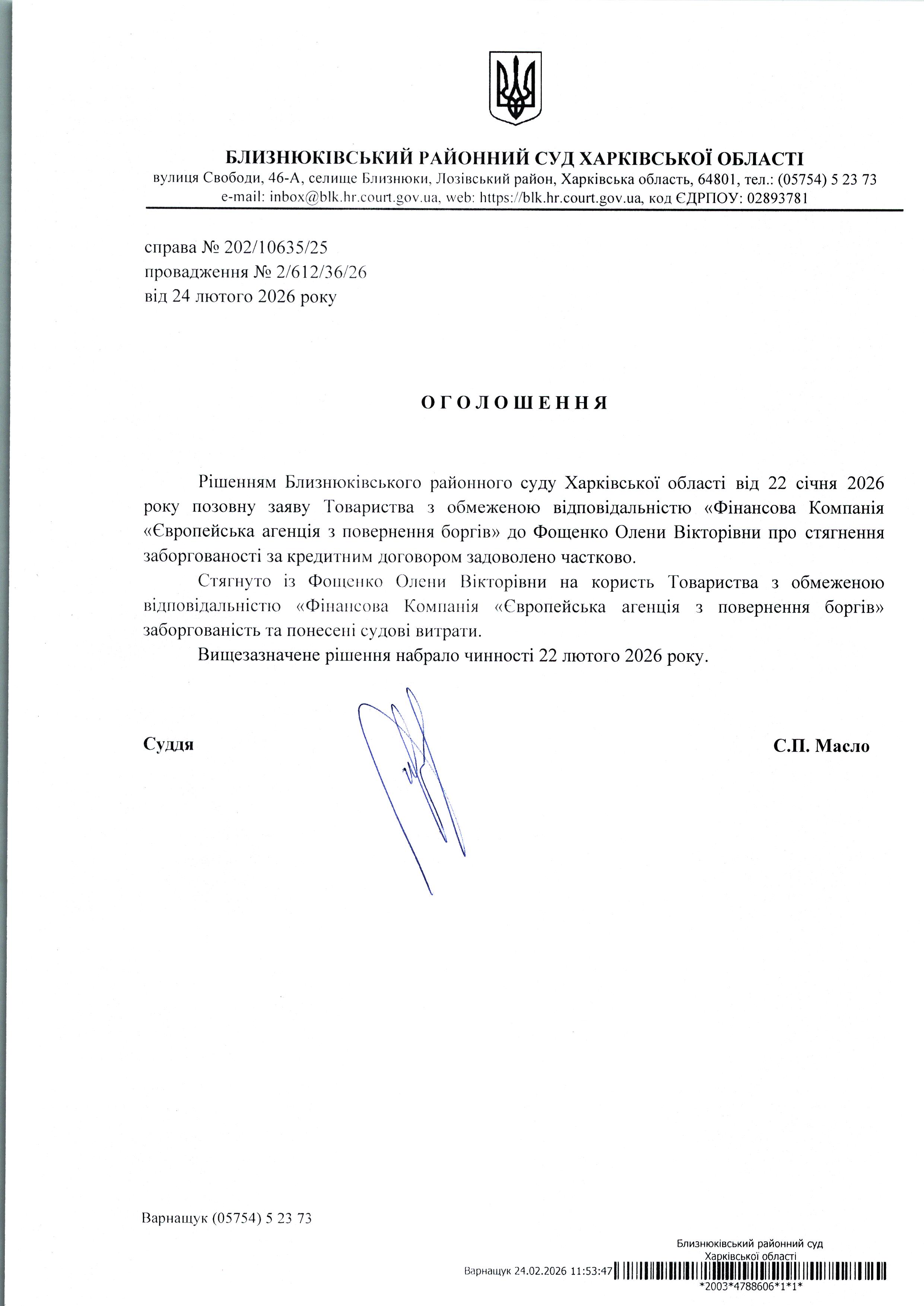 Оголошення про набрання чинності рішення суду від 22 січня 2026 року за позовом ТОВ "Фінансова Компанія "Європейська агенція з повернення боргів" до Фощенко Олени Вікторівни про стягнення заборгованості